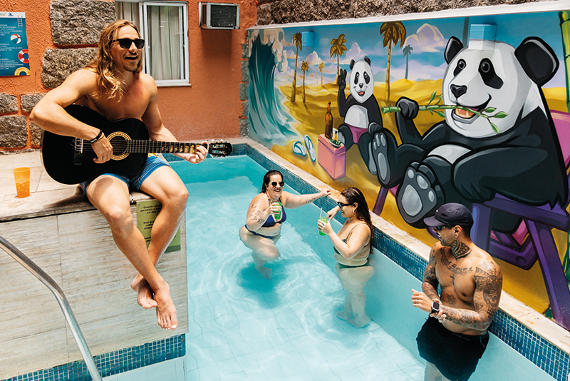 Convivencia: Bamboo Bar, piscina, zona de barbacoa y el bar de hostel más animado de Copacabana, con happy hour diario 2x1.