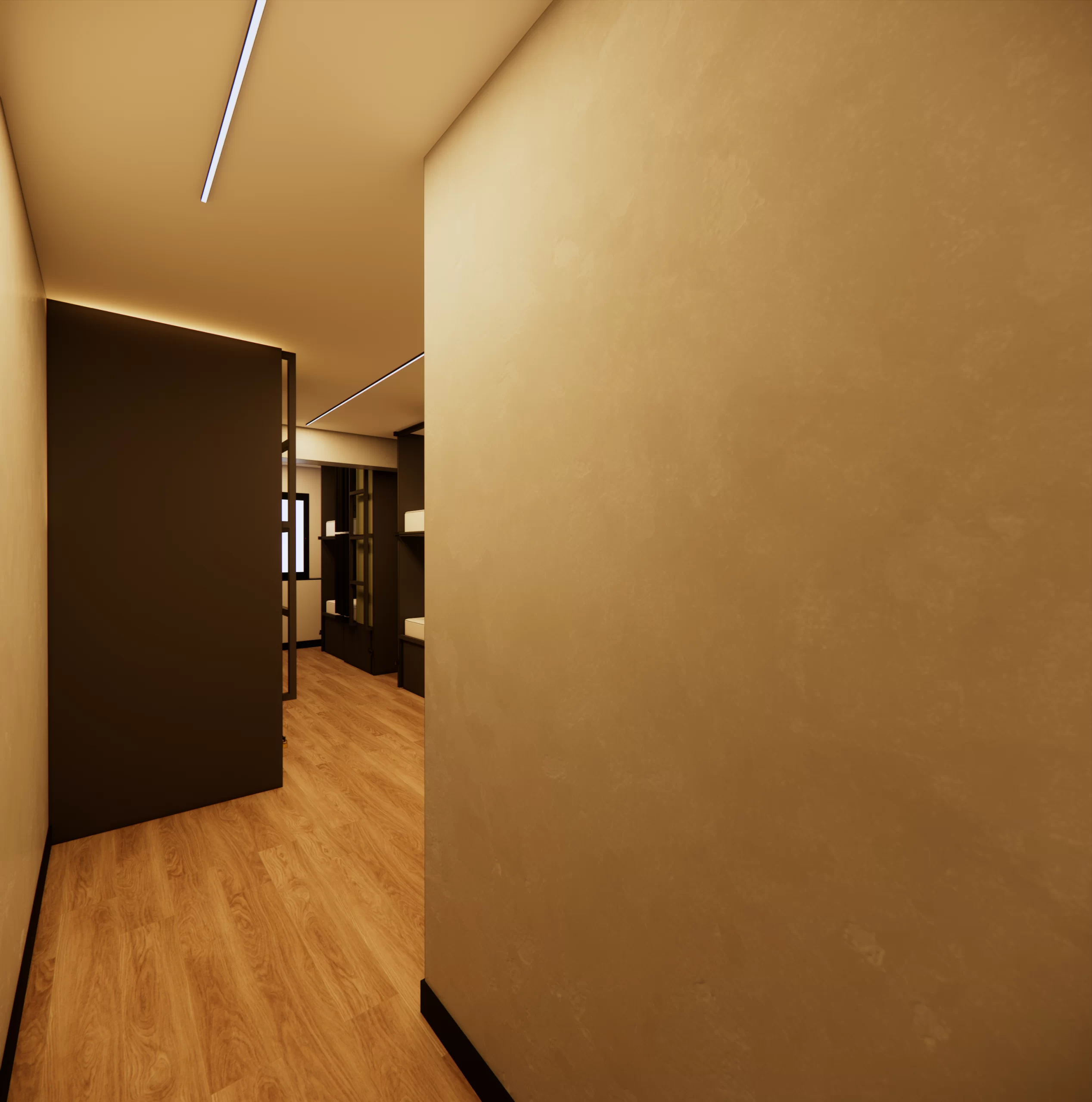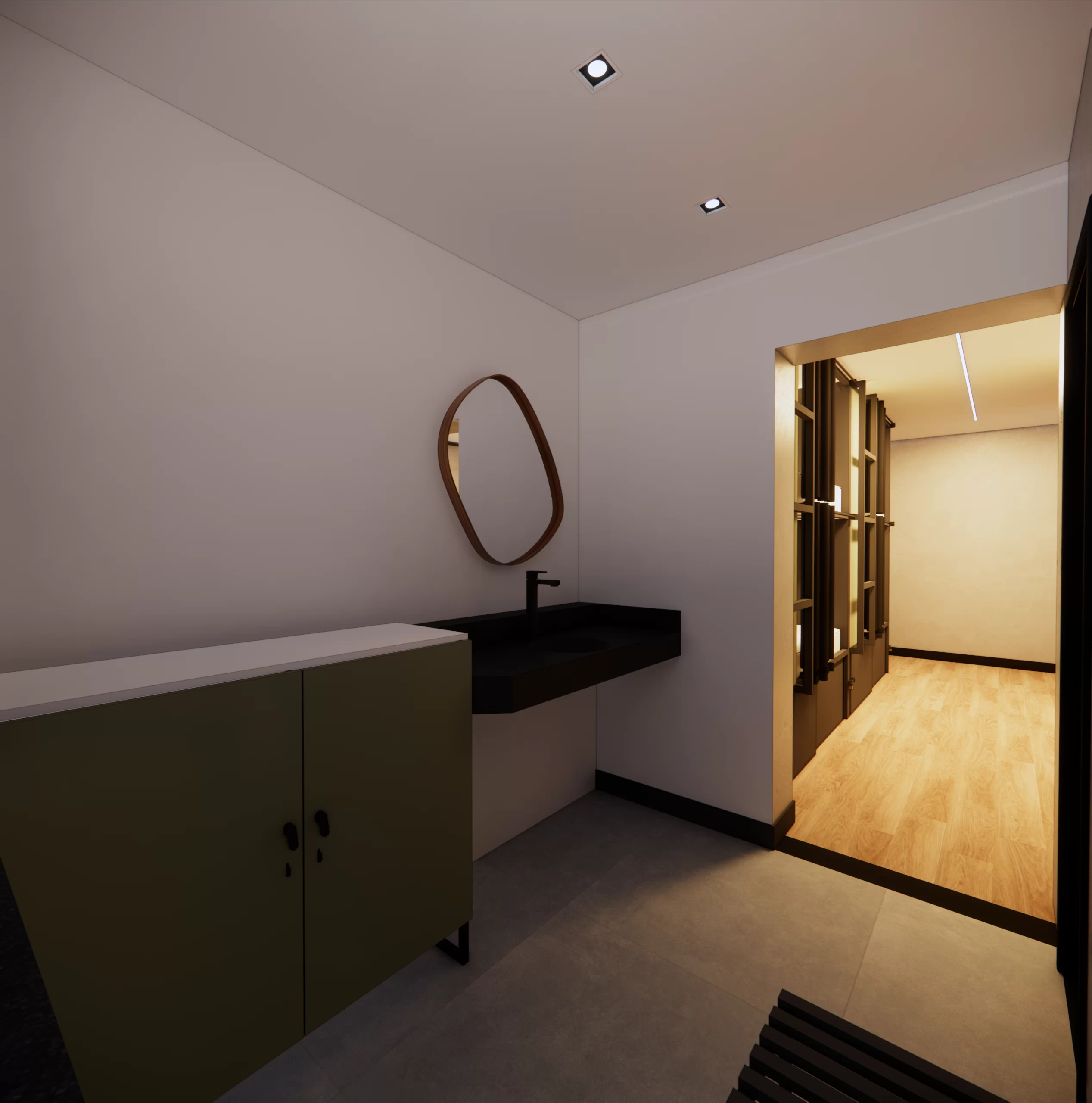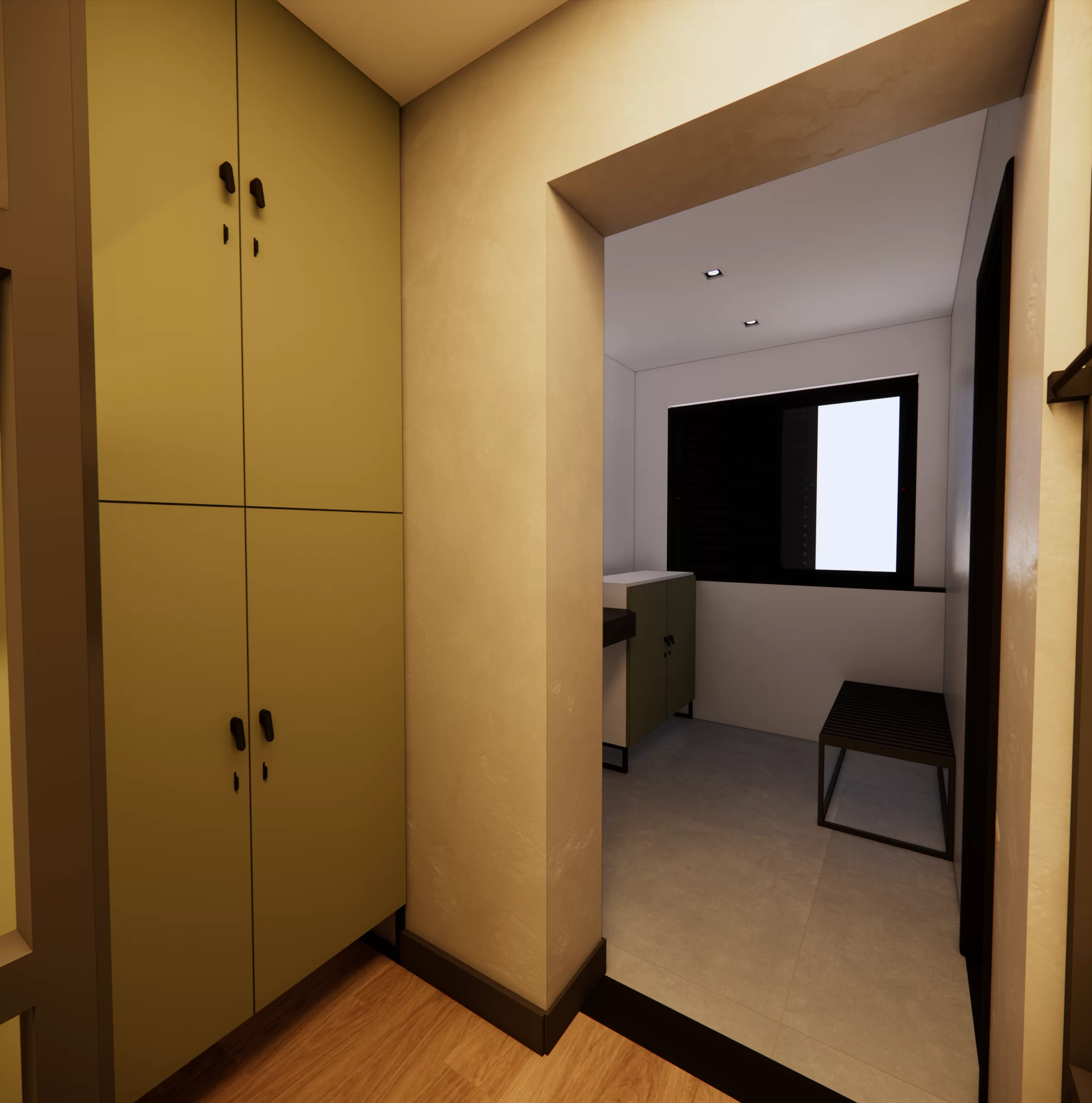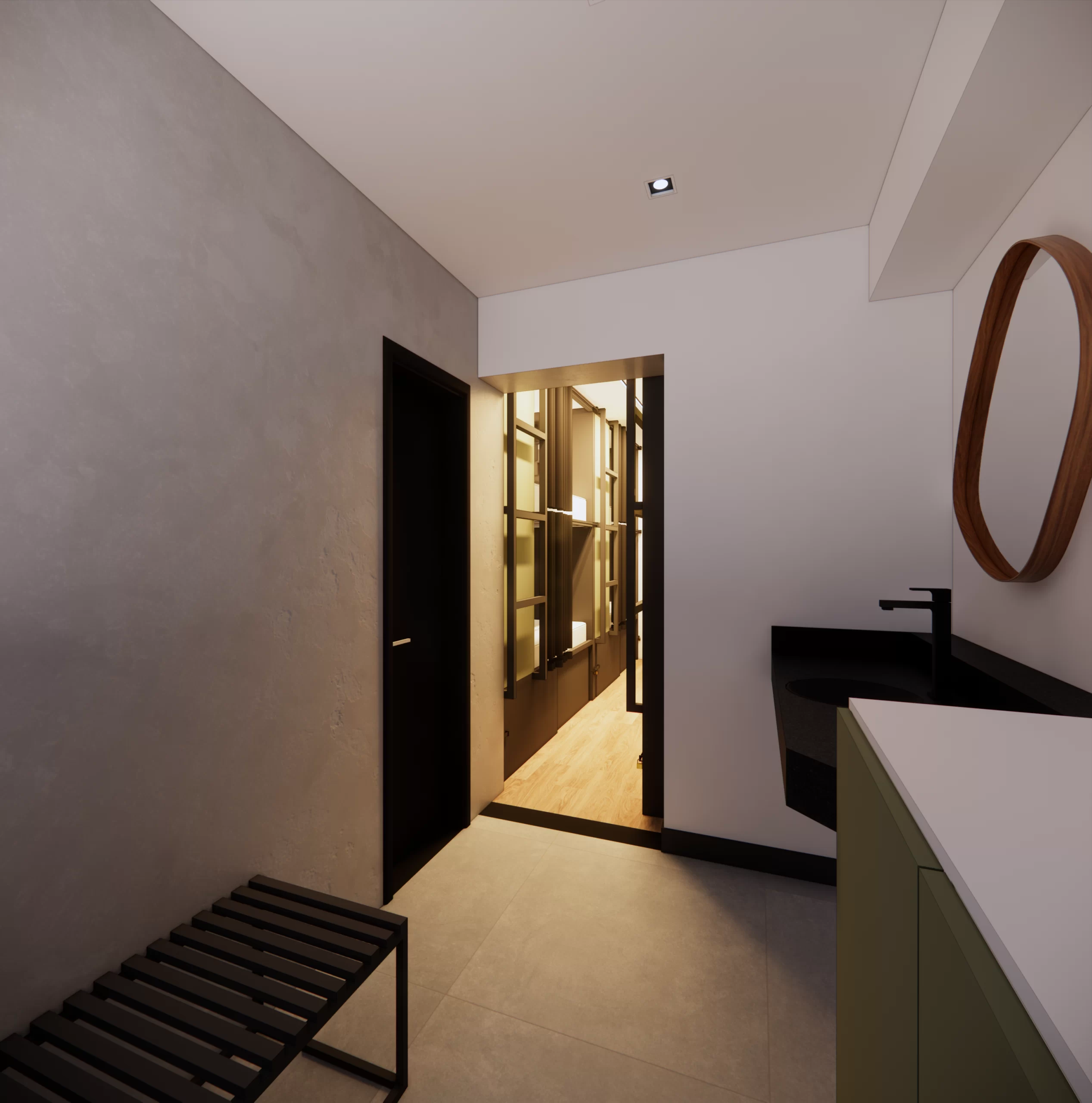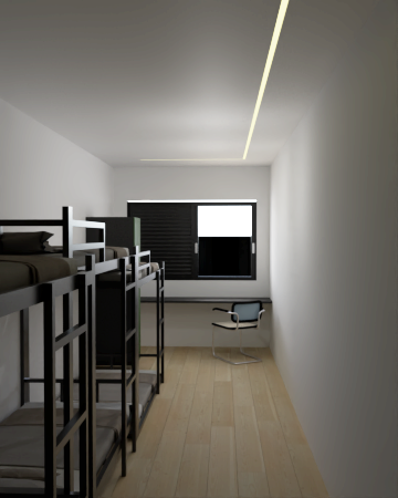 Quarto compartilhado moderno com beliches estilo cápsula, cada uma com cortina, luz e tomada individual.